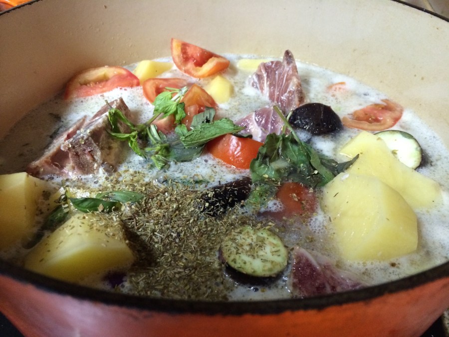 (3) Now, this is my magic touch. Collect ends of most unlikely vegetables, such as aubergine, capsicum, parsley stalks, celery heads, etc, freeze them, and just add them to the pot at the beginning of the cooking period.  Over the hours, it will disintegrate to leave behind the most unique taste!