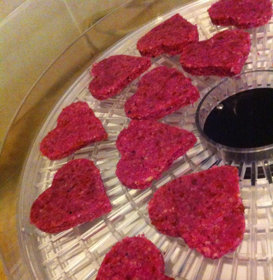 Take half of the mix and place onto a pastry mat. Spread out and place a piece of cling film plastic on top. Roll to about a half cm thickness. Cut with a cookie cutter (I love hearts!) Place in a dehydrator for 24 hours at 40 celcius.